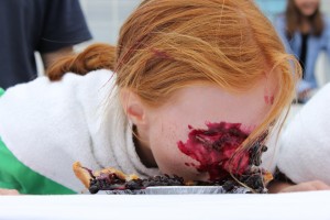 Redhead at Fiesta pie eating contest makes sure to get her daily requirement of anti-oxidants